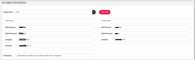 In this Sub-Module, Accident Simulation is performed and when a valve is closed, it is calculated how long it takes for the outlet pressure to be 45 bar.