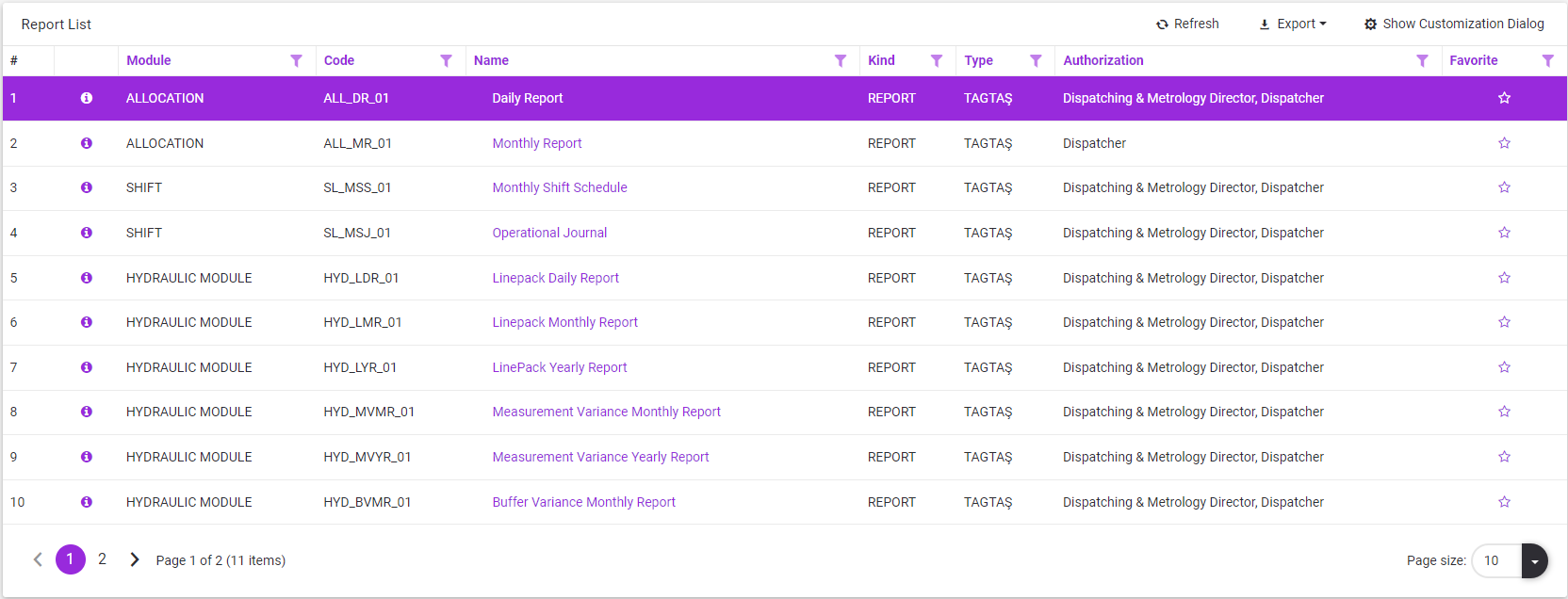 The listing shows all the defined reports with report's module, code, name, type, type, and authorized user roles.
