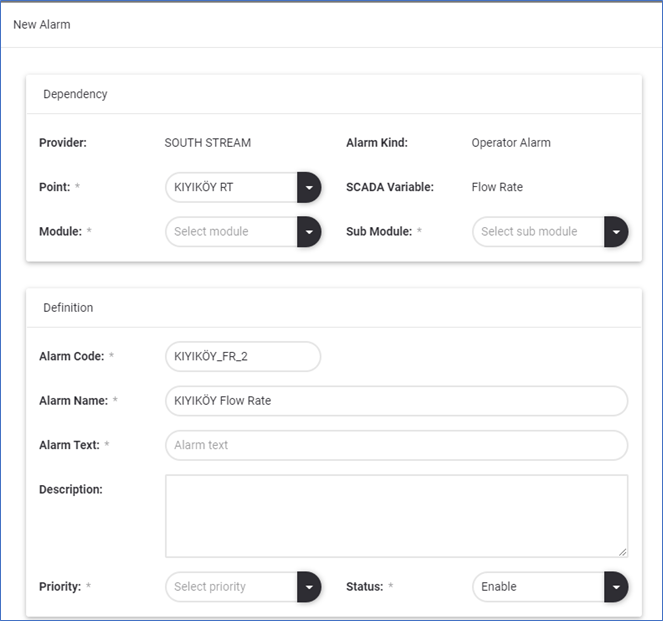 oThe module and sub module to which the alarm depends on selected from the module/sub module list.