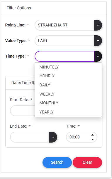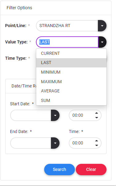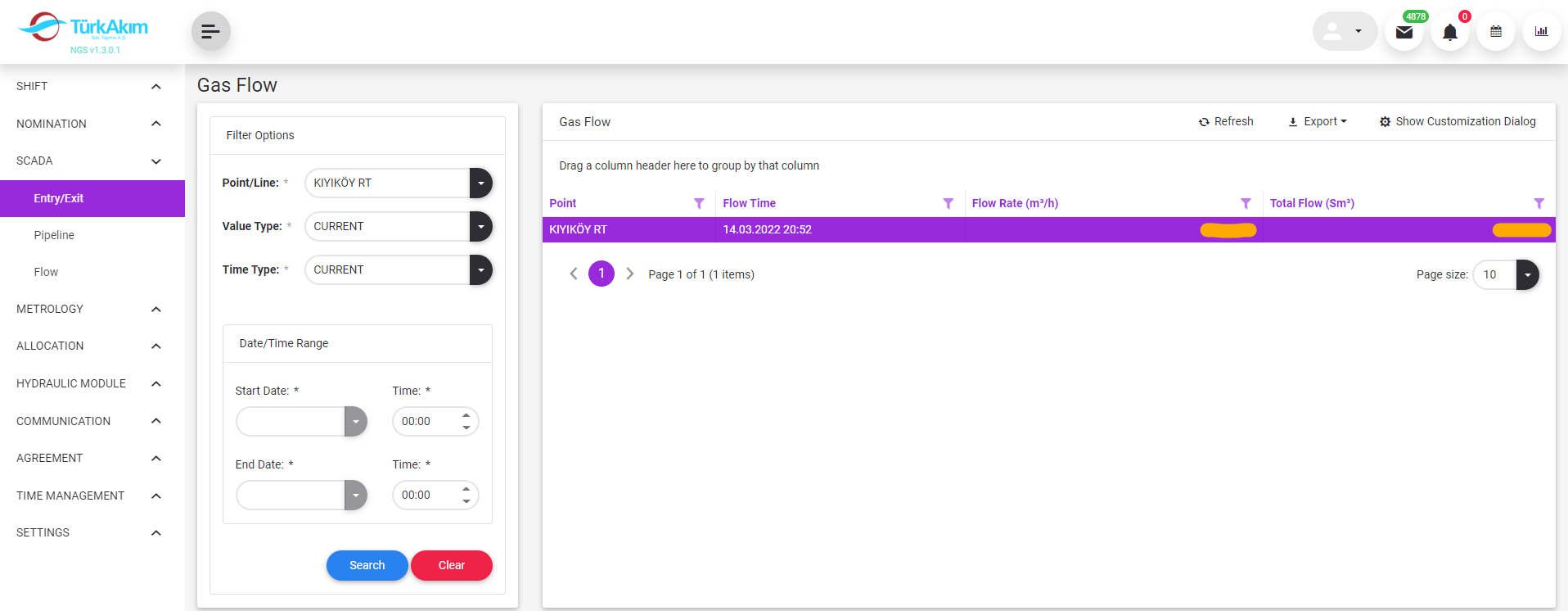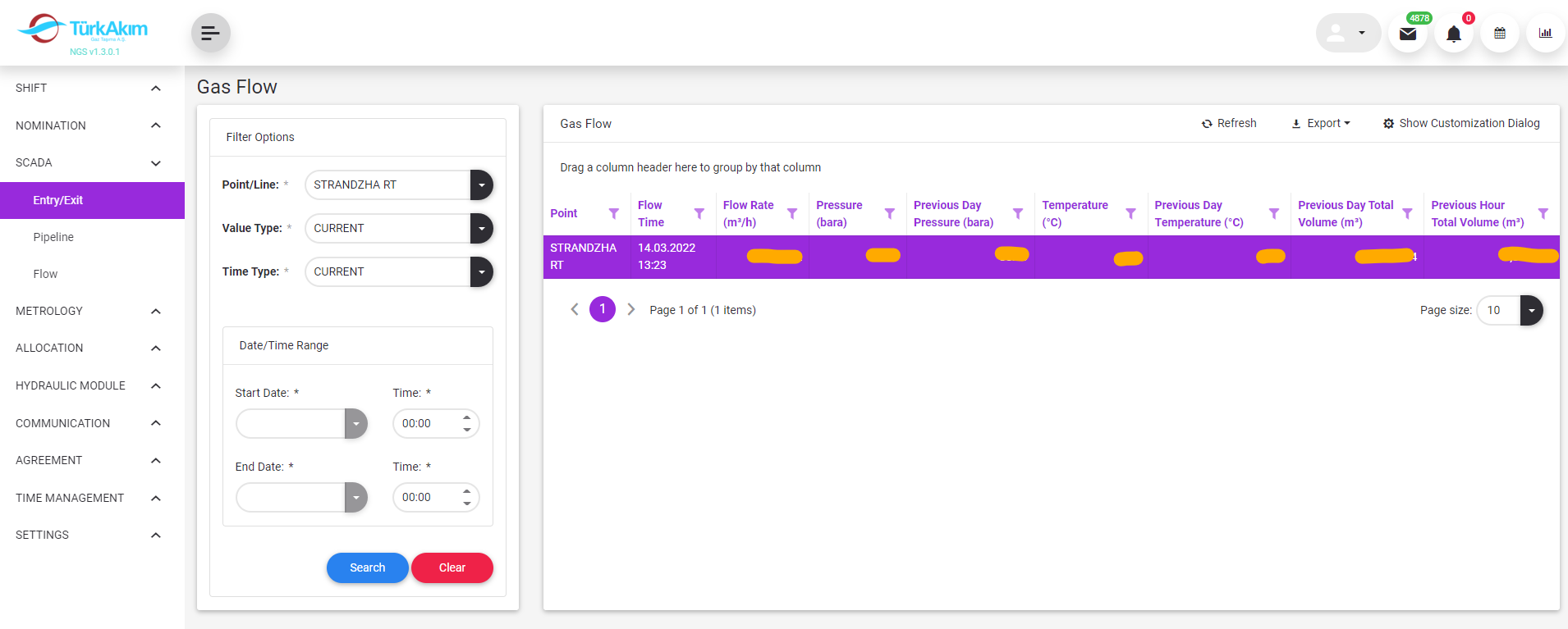 Gas flow values are displayed according to the point, value, and time options from the SCADA system.