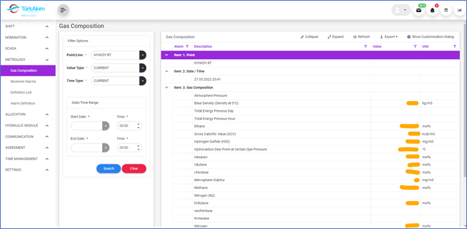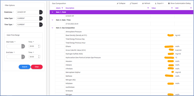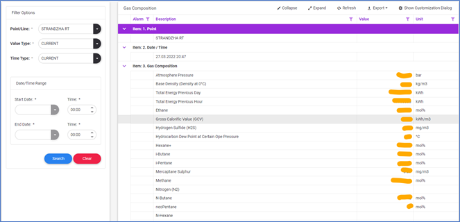 Gas composition values are displayed according to the point, value, and time options from the SCADA system.