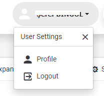 The username is displayed in the right pane of the Header. It is used to access the settings of the user logged into the system. Clicking on it will display "Profile" and "Exit" Buttons.
