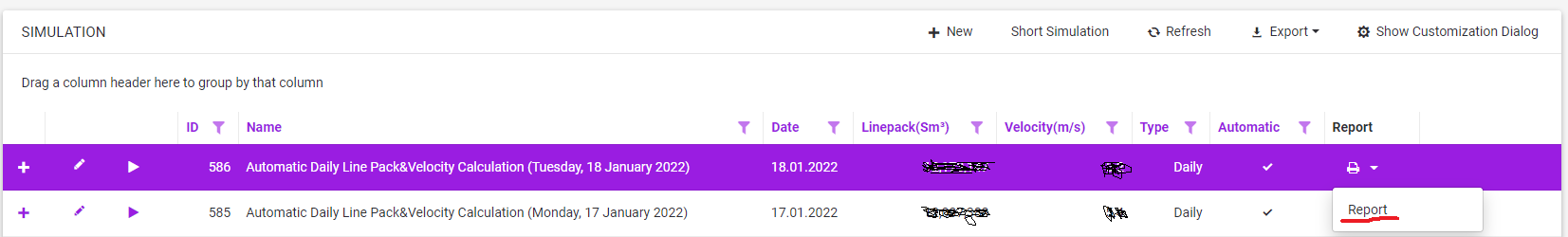 In Report, all input values and output values are shown separately for each line in details. Also includes velocity diagram, pressure diagram and line pack diagram.