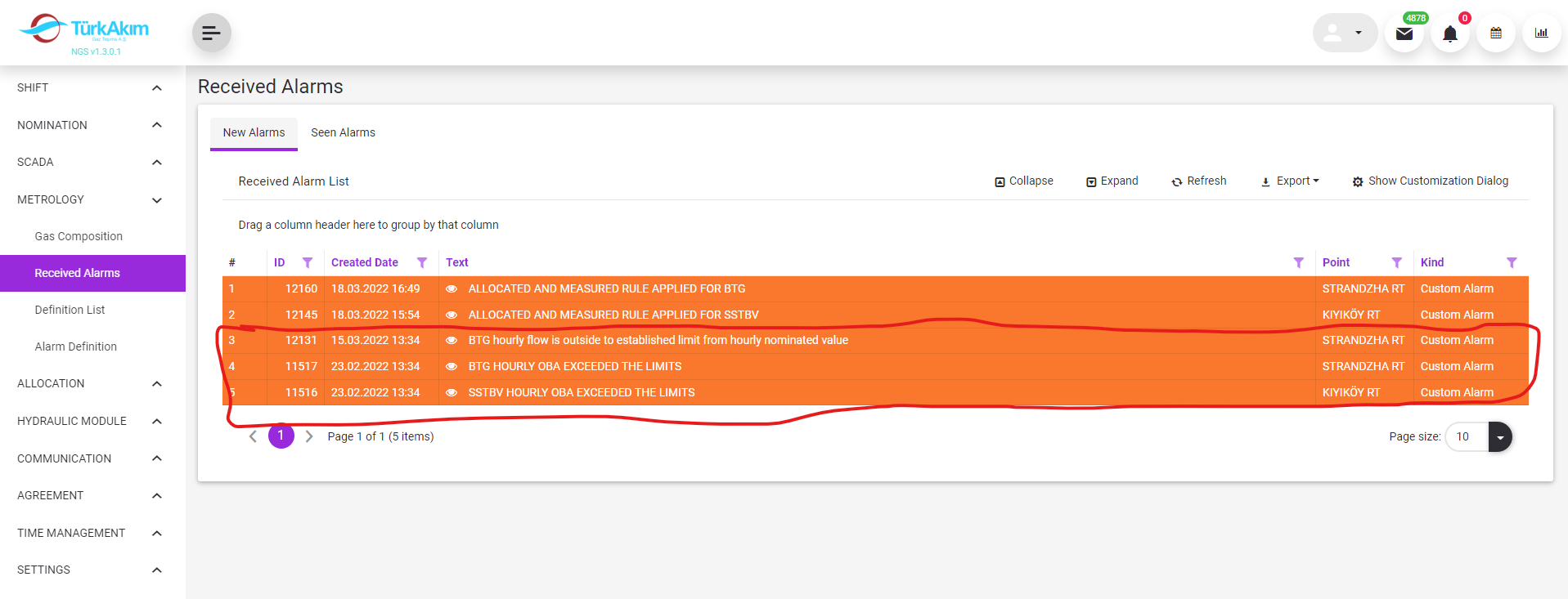 When the OBA limits are approached or the OBA limits are exceeded, the user is warned with animated alerts which are listed in Received Alarms.