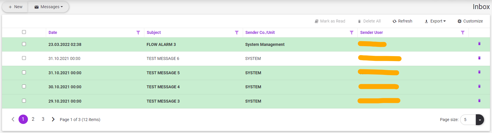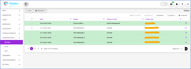 Incoming messages are displayed with green background and bold text. When the message line is clicked, the message is displayed below the message list and is automatically marked as read.