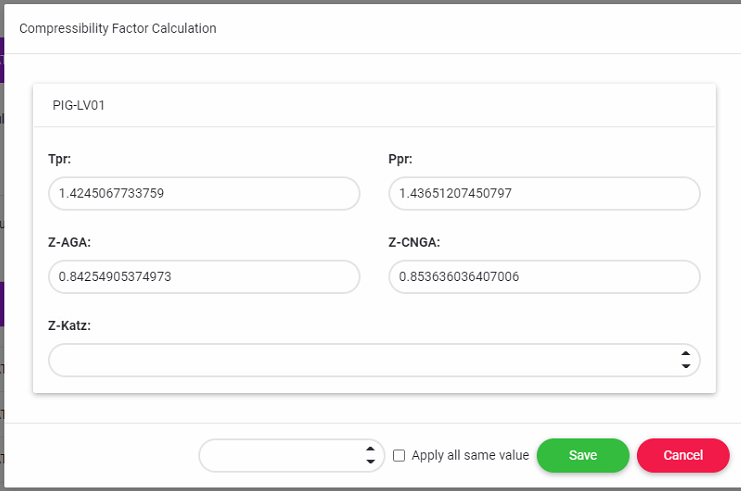 Pressing Calculate Compressibility Factor Calculation popup window is opened.