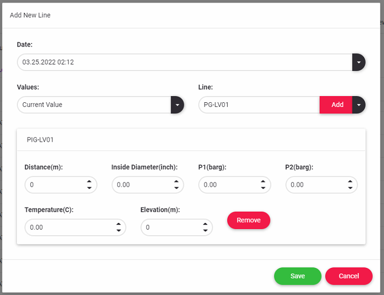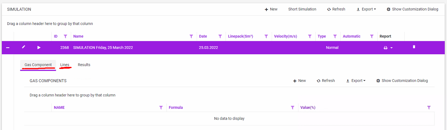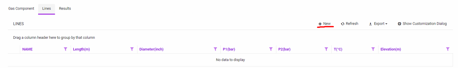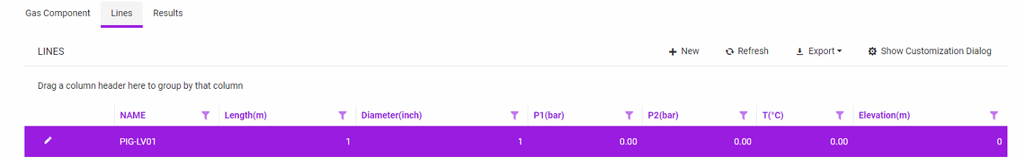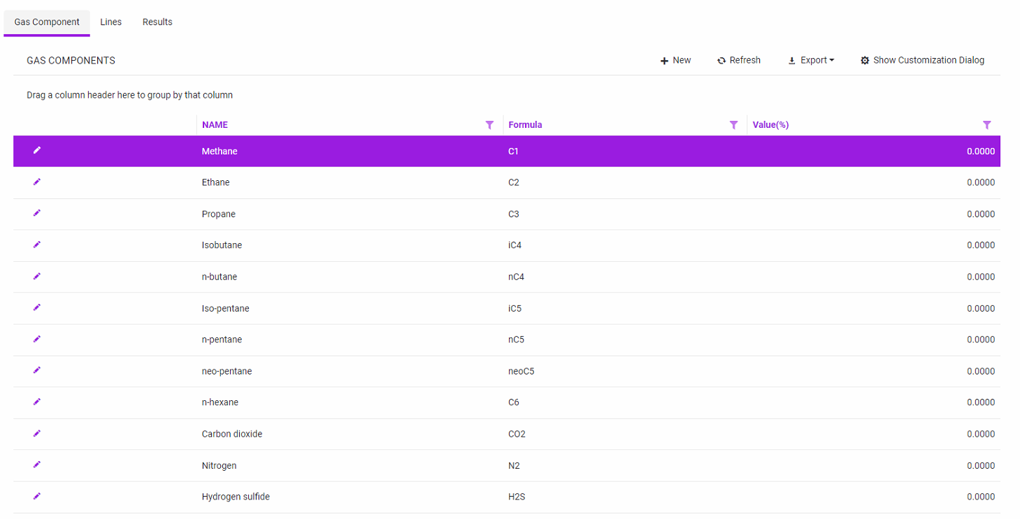 By pressing “+” button, Gas Components and Lines properties can be add the project.